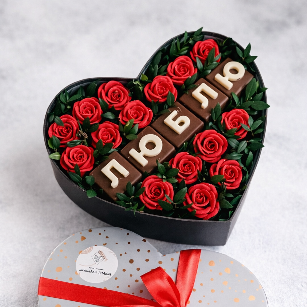 Подарунковий бокс у формі серця з шоколадними кубиками, що складаються у слово «ЛЮБЛЮ» (надпис може бути змінено!), доповнений розкішними червоними трояндами — ефектний жест, який запам’ятовується.❤️
