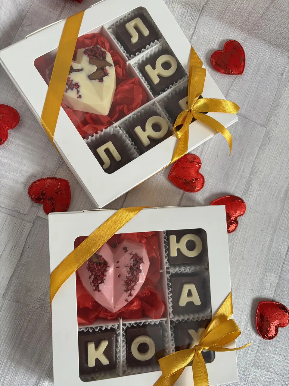 Квадратики з молочного та білого шоколаду складаються у тепле «КОХАНОМУ / КОХАНІЙ», а шоколадні сердечка додають ще більше ніжності.💞