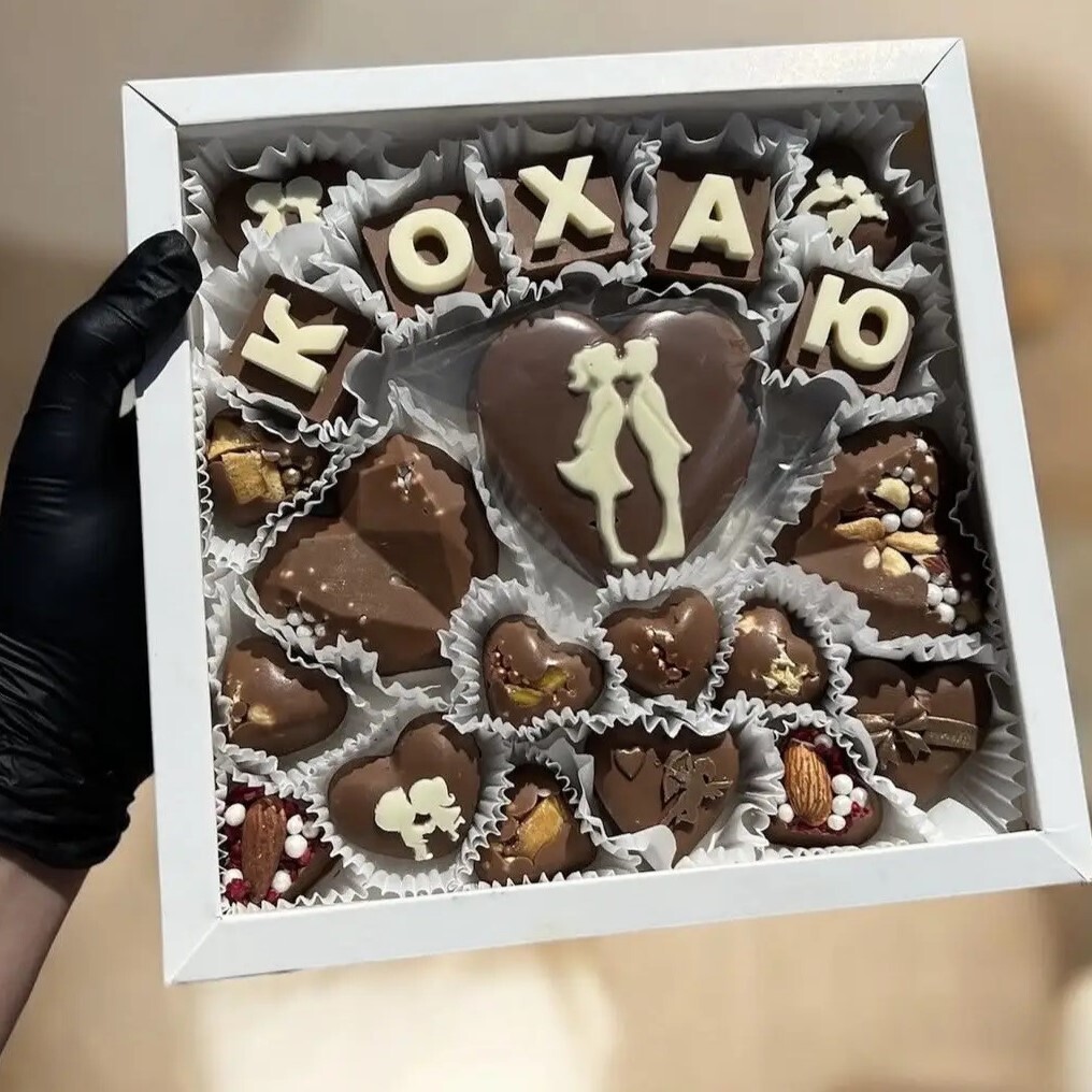 🍫Авторський шоколадний набір ручної роботи з ніжного шоколаду, доповнений цукерками у формі сердець та шоколадними кубиками з написом «Я тебе кохаю». Кожен елемент створений з увагою до деталей і наповнений теплими емоціями💞