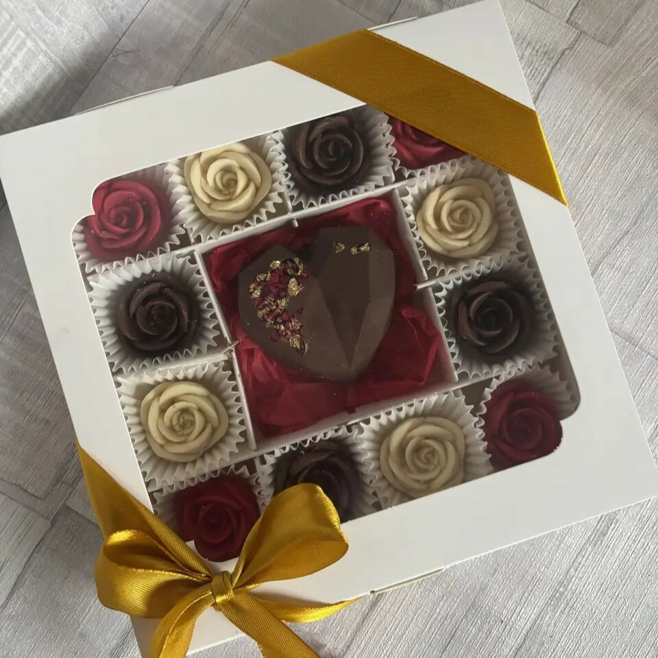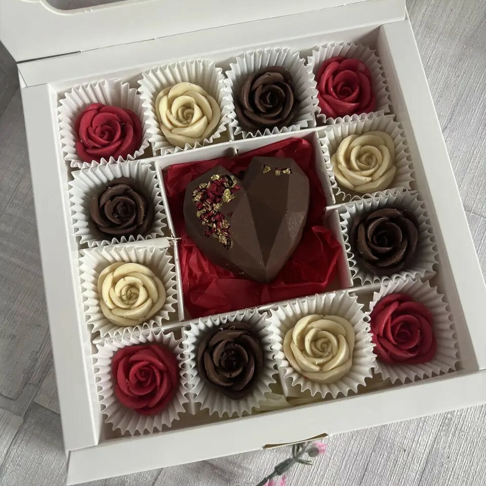 Набір шоколадних цукерок, що включає фігурки у формі троянд 🌹 з різного шоколаду та серце або "ВІСІМКУ" (на вибір), ❤️ прикрашене їстівним золотом і пелюстками.