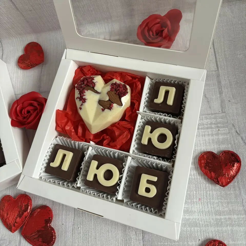 Молочний шоколад з буквами з білого шоколаду, доповнений серцями з горіхами, ягодами та насінням — кожна цукерка з власним смаком і настроєм.🎁
