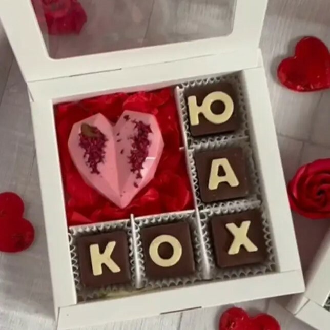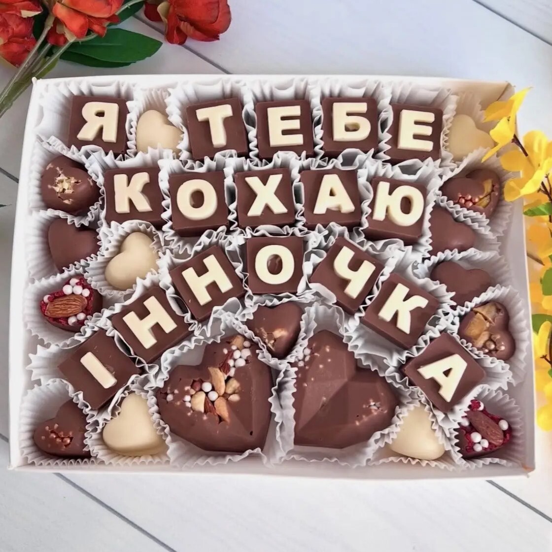 Квадратики з молочного та білого шоколаду складаються у тепле «КОХАНОМУ / КОХАНІЙ», а шоколадні сердечка додають ще більше ніжності.💞