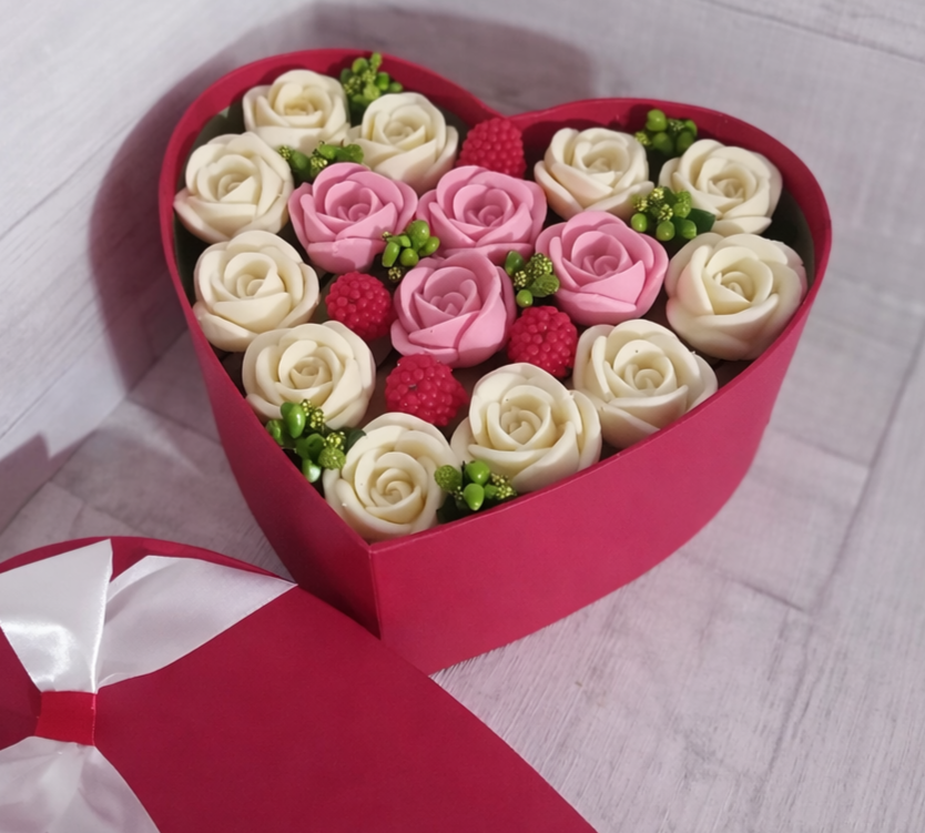 🍫Елегантний подарунковий набір у формі серця з авторськими шоколадними трояндами, доповненими яскравими ягідними нотами та витонченим декором. Поєднання кремових і рожевих відтінків створює атмосферу тепла, любові й турботи.🎁