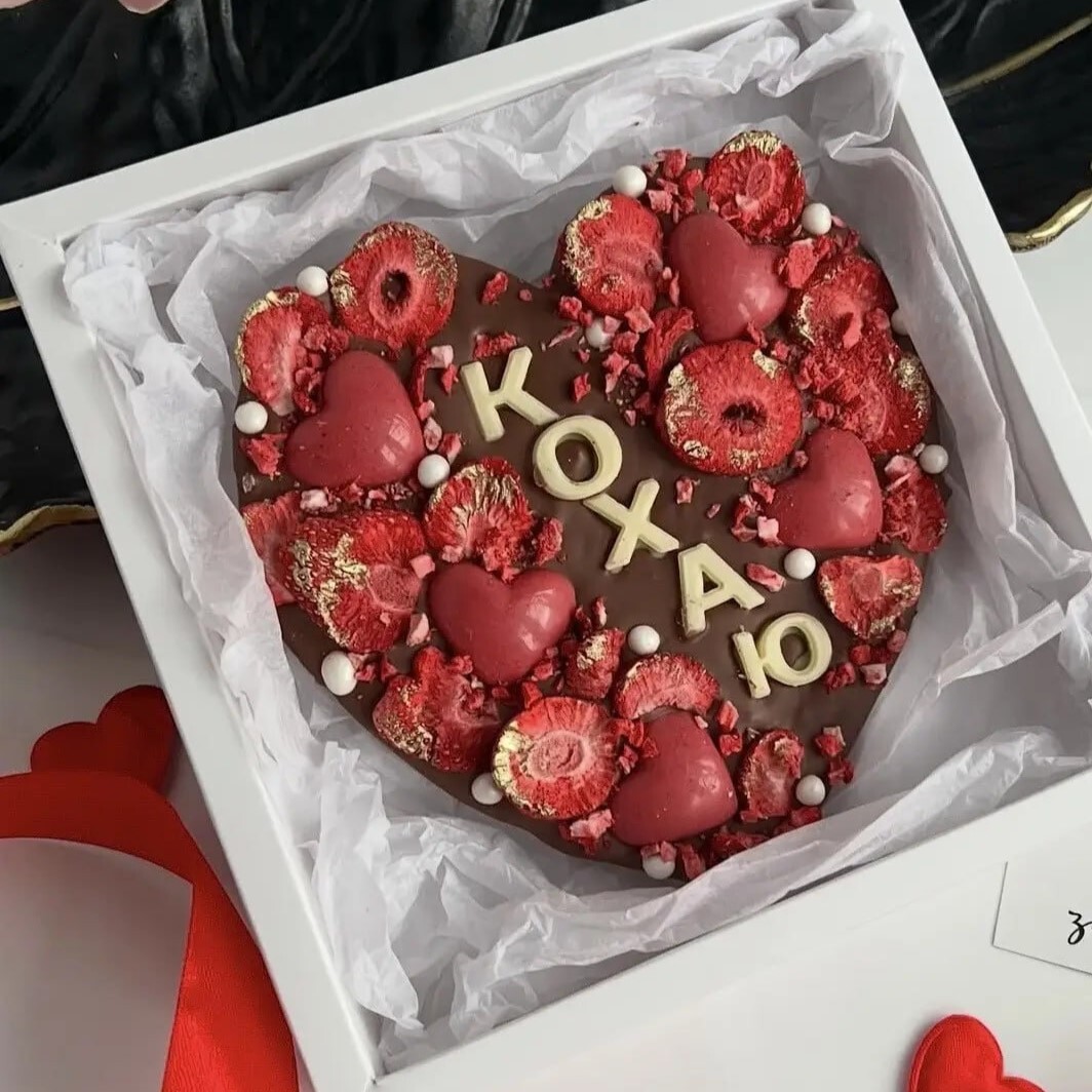 Молочний шоколад з буквами з білого шоколаду, доповнений серцями з горіхами, ягодами та насінням — кожна цукерка з власним смаком і настроєм.🎁