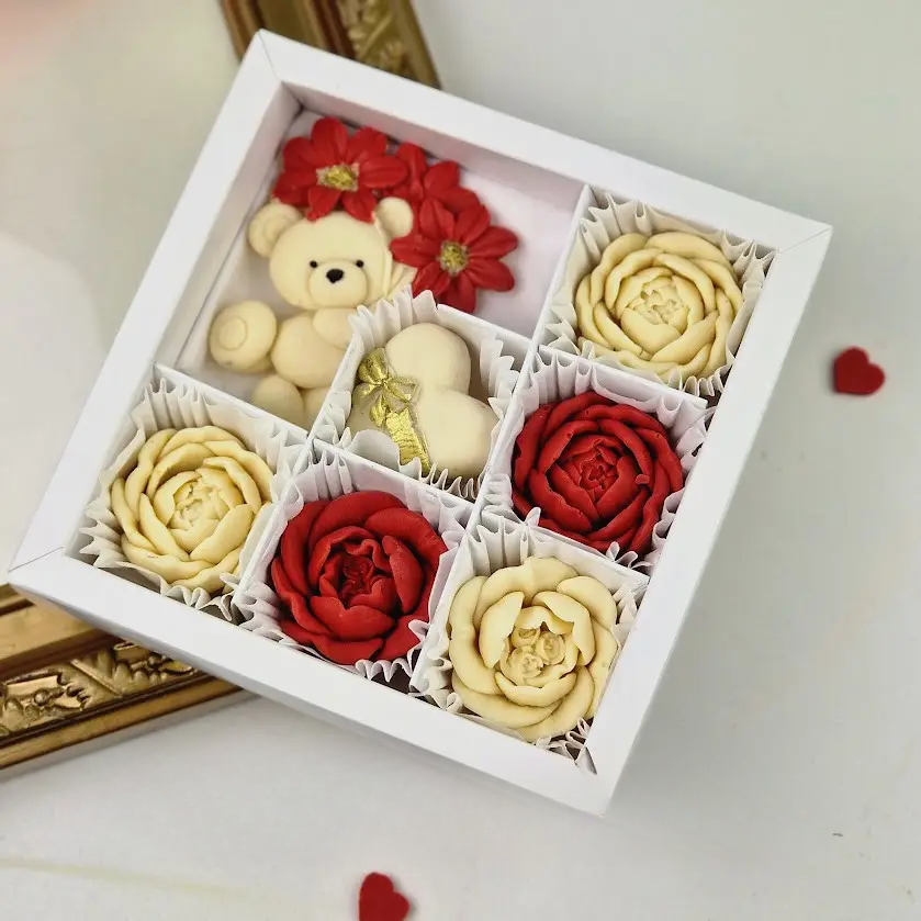 Ніжні шоколадні квіти ручної роботи, милий ведмедик та сердечко з золотим акцентом утворюють гармонійну композицію, яка дарує тепло, турботу й щирі емоції з першого погляду 🍫🌸