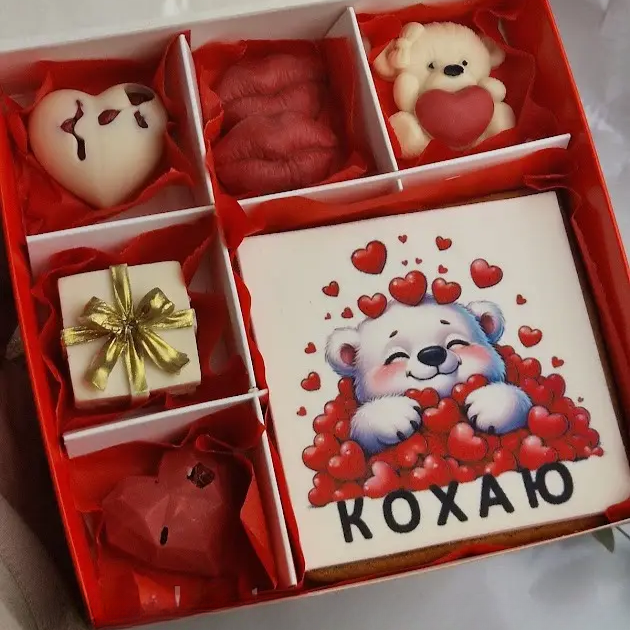 🍫Авторський шоколадний набір ручної роботи з ніжного шоколаду, доповнений цукерками у формі сердець та шоколадними кубиками з написом «Я тебе кохаю». Кожен елемент створений з увагою до деталей і наповнений теплими емоціями💞